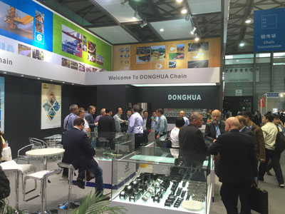 展會中,東華的宣傳片作為唯一一家企業的宣傳品在展會主大廳大屏幕循環播放,過道上也是由東華的醒目LOGO裝飾,吸引了廣大客戶的目光。今年中國鏈傳動件設在N5展館,東華展廳120多平方米,設計新穎、大氣,觀眾一走進展廳,便被豐富齊全、造型各異的精美鏈條所吸引,展品有最新生產的各類高、精、尖傳動鏈、輸送鏈、農機鏈、工程鏈等,特別是從德國公司送來參展的大型鋼廠輸送鏈,造型新穎,吸引了絡繹不絕的客戶和觀眾參觀。