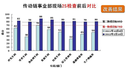 2S管理明顯提高并標(biāo)準(zhǔn)化作業(yè) 通過(guò)2S的運(yùn)行,傳動(dòng)鏈?zhǔn)聵I(yè)部員工的現(xiàn)場(chǎng)2S意識(shí)和管理都得到了明顯提升,如包裝車(chē)間現(xiàn)場(chǎng)管理的雜亂改善到目前的現(xiàn)場(chǎng)流程規(guī)范、通道流暢、物品擺放整齊等,熱處理車(chē)間設(shè)備運(yùn)行狀態(tài)可視化等;同時(shí)廣大員工學(xué)會(huì)了總結(jié)與標(biāo)準(zhǔn)化操作,如現(xiàn)場(chǎng)檢查標(biāo)準(zhǔn)化、任務(wù)改善驗(yàn)證標(biāo)準(zhǔn)化、管理點(diǎn)檢標(biāo)準(zhǔn)化、現(xiàn)場(chǎng)作業(yè)標(biāo)準(zhǔn)化等。