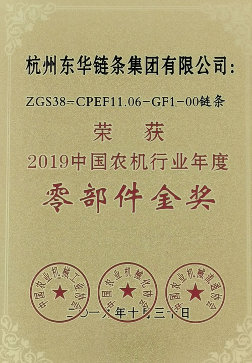 展會(huì)期間,舉行了2019中國(guó)農(nóng)機(jī)行業(yè)年度頒獎(jiǎng)典禮,東華生產(chǎn)的ZGS38-CPEF11.06-GF1玉米收獲機(jī)用鏈條榮獲“2019中國(guó)農(nóng)機(jī)行業(yè)年度零部件金獎(jiǎng)”,是鏈條行業(yè)唯一獲此殊榮的產(chǎn)品,是中國(guó)農(nóng)機(jī)行業(yè)的最高榮譽(yù)。該產(chǎn)品具有結(jié)構(gòu)新,用途巧等特點(diǎn),是東華近年來研發(fā)的高端鏈條產(chǎn)品。