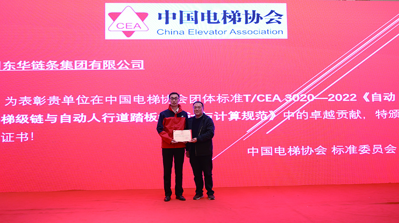 近日,中國電梯協(xié)會標(biāo)準(zhǔn)委員會授予東華鏈條集團榮譽證書,以表彰東華在中國電梯團體標(biāo)準(zhǔn)T/CEA 3020-2022《自動扶梯梯級鏈與自動人行道踏板鏈設(shè)計與計算規(guī)范》中的卓越貢獻(xiàn)。東華扶梯工程鏈?zhǔn)聵I(yè)部代表公司出席了頒獎儀式。